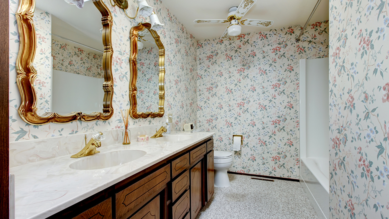 Бумажные обои для ванной комнаты не годятся, но подойдут флизелиновые. Они не боятся влаги, их пористая структура пропускает воздух, борясь с появлением плесени. Можно также использовать виниловые или акриловые обои, главное – обращать внимание на уровень их влагостойкости.