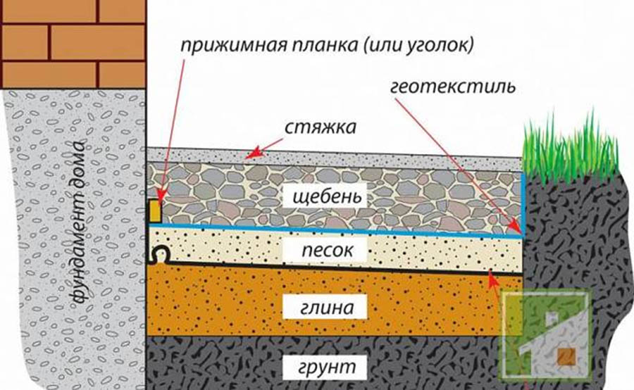 Уровень отмостки должен быть всегда выше уровня окружающего дом участка. Для этого вокруг фундамента должны быть созданы скаты грунта, которые создадут уклон почвы на достаточное расстояние от стен здания. Сама отмостка делается из гравия или щебня – так её можно будет время от времени подсыпать, в процессе проседания. Такая отмостка является временной, окончательно её можно будет доделать, забетонировав, уже после того, как грунт перестанет проседать.