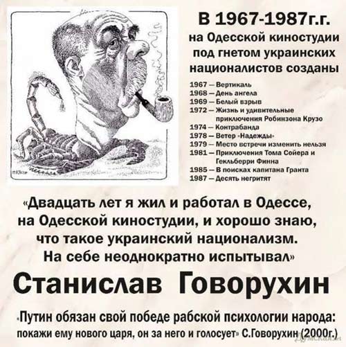 Господин Говорухин, сказав «А» - скажите-ка «Б»: кто именно, как и чем притеснял вас в Одессе, на нашей родной киностудии? Какие садисты на нашем Французском бульваре безжалостно выворачивали вам руки и мозги, требуя экранизировать книжки злобствующих и закоренелых украинских националистов Даниэля Дефо, Марка Твена, Агаты Кристи и Жюля Верна, да еще на русском языке?