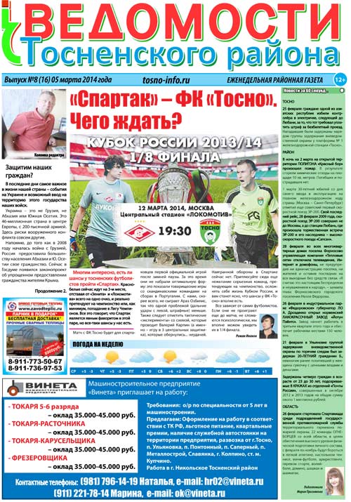 Тем временем 12 марта провинциальный районный центр Тосно (юго-восток Ленинградской области), родина вышеупомянутых независимых «Ведомостей Тосненского района», стал героем всероссийской футбольной новости: СК «Тосно» обыграл «Спартак» со счетом 0:1 и вышел в четвертьфинал Кубка России.