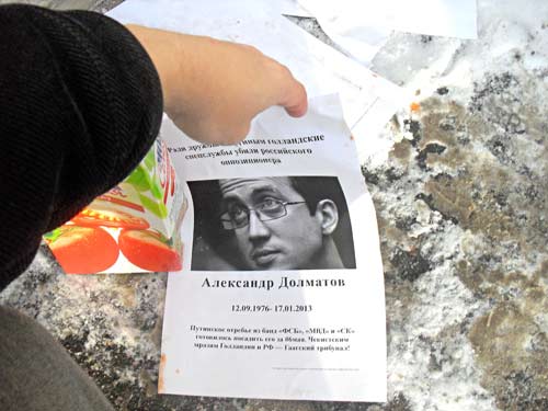 Александр Долматов, активист «Другой России», который проходил по делу 6 мая, погиб в тюрьме в Голландии. По этому поводу 26 числа четверо граждан пришли к консульству Голландии (Нидерландов), вылили томатный сок на вход, распространили листовки, что они в этом обвиняют Путина и его чекистскую банду из ФСБ, ГУВД и так далее.