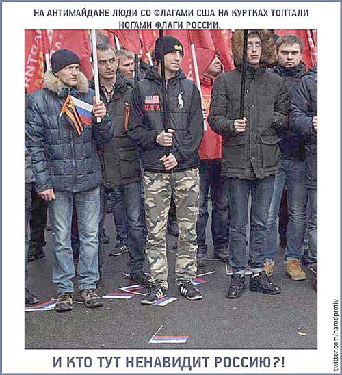 Недавно вот Антимайдан в России создан. В противовес Майдану, который в Украине. У нас-то, в России, никакого Майдана нет и не предвидится, а поди ж ты… Прошелся этот Антимайдан по Москве. Топча при этом российские флаги. Ну не флаги, а так себе, флажки, но неуважение к российской государственной символике налицо. В других (назначенных сверху) городах тоже было подобное действо – за Путина и против Майдана. В разным успехом. В Петрозаводске (Карелия) на антимайдановский митинг пришло полтора десятка озабоченных. Это что, 84% петрозаводцев? А сколько ж там жителей?