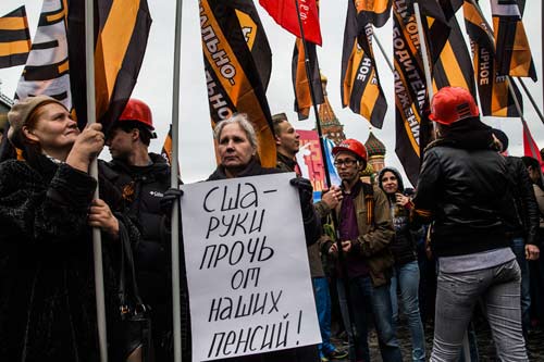 Начать с того, что их мэр Собянин и его окружение вырядились в шарфики георгиевской расцветки. Молодежь еще и завязала их, как шарфики сейчас модно завязывать. НОД (Национально-освободительное движение) увеличило георгиевские ленточки до флагов, испортив их названием своего движения. Ну и безумные плакаты и транспаранты. Кажется, уже все видели эту старушенцию с метровым плакатом насчет «Обама, руки прочь от моей пенсии». Понятно, насчет пенсий – все претензии к Обаме, а не к нашему правительству и Пенсионному фонду. В общем, абсурд маразмом погоняет.