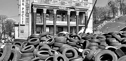 И опять и опять упрямо движущиеся вперед фигурки, вытаскивающие раненых из-под огня, завывание скорых, чей-то голос в громкоговоритель: «Кияне, кияне, улица Бориславска, 3, принимают кровь для раненых»; горький запах резины, фитильки из белых разорванных на полоски тряпочек, засунутые в бутылки и банки с «коктейлем Молотова», таинственные снайперы, простреленные металлические щиты из ржавого железа с пятнами крови, девочка-волонтер, раненная в шею, серое обличье «Беркута», хлещущая кровь, черные закопченные лица, покрышки, огонь, хаос, хаос, хаос.