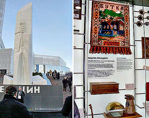 Вряд ли устроители музея ставили перед собой такую задачу, но вся экспозиция — это вызов идеологии сегодняшней путинской России. Все начинается вполне традиционно: лимузин «товарища первого секретаря», стенд с подарками президенту, вполне лубочное повествование о родной деревне.
