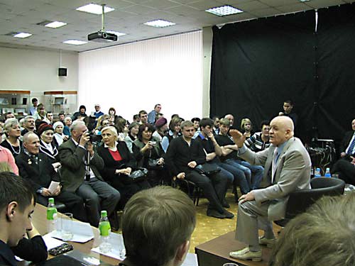 В зал на 50 мест втиснулись около 150 человек. Сколько осталось у входа – не знаю. Краевая библиотека – это хранилище письменных раритетов, объект охраняемый, и потому, разумеется, Александр Брюханов, ее директор, не мог рисковать, устраивая давку на лестнице и в проходах.