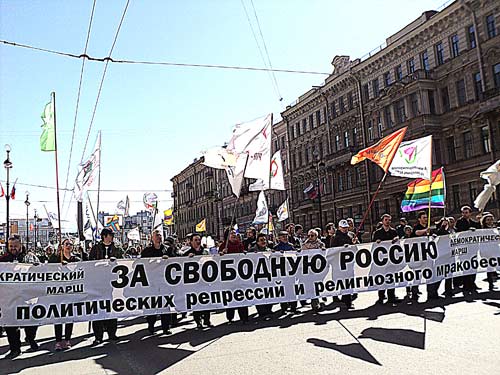 Шестиметровый баннер «Навальному – волю!» организовали активисты касьяновской РНДС (партия вошла в «РПР-Парнас»), под руководством Андрея Пивоварова. «За Россию без религиозной истерии». Скандируют: «Долой призывное рабство!» «За свободную Россию, за светское государство!». «Гомофобия – позор Петербурга!». «Третий срок – тюремный». Замыкают колонну демократов «Наблюдатели Санкт-Петербурга».