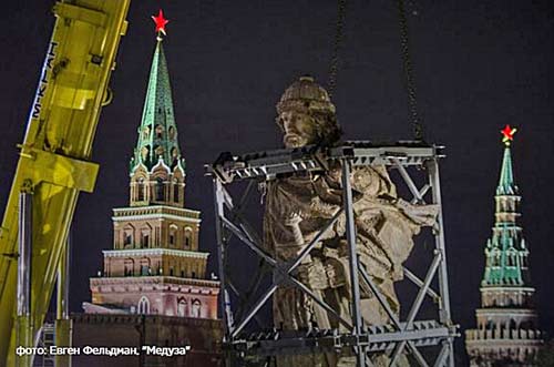 Запоздалый памятник, между прочим. Он был задуман тогда, когда «русский мир», Крымнаш, Новороссия были на пике моды. Ну еще там Корсунь священный был, или что-то подобное. Быстро забывается всё, да. Нет уж того энтузиазма даже по поводу Крымнаша, а о Новороссии и говорить смешно. Тем не менее памятник Владимиру наконец-то сделали – и установили у Боровицкой башни, у Кремля. Всё верно. Памятник «русскому миру», воплощение идеи Новороссии. Рядом с Боровицкими воротами, куда время от времени въезжает автор идеи.