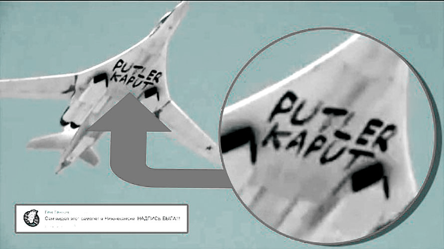 Журналист Александр Минкин выложил в своем блоге видеозапись, на которой отчетливо видно, что во время репетиции воздушного парада на «брюхе» стратегического бомбардировщика, пролетавшего над Москвой, красовалась надпись: «Putler Kaput».