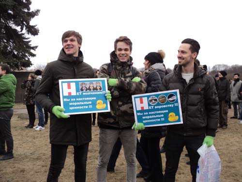 НОДоовцы (слева) в мегафон женским голосом зазывали к себе толпы, вливавшиеся на Марсово поле с Садовой, с Миллионной и с набережной реки Мойки и явно стремившиеся направо, «к Навальному». На фоне нодовского плаката: «Святая Русь – Россия, Украина, Беларусь» фотографировались навальновцы, раскрашенные зеленкой.