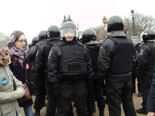 В стороне, на проезжей части улицы вторым рядом стоят три автозака для будущих задержанных, несколько автобусов, на которых привезли ОМОН, и начальственные легковушки.