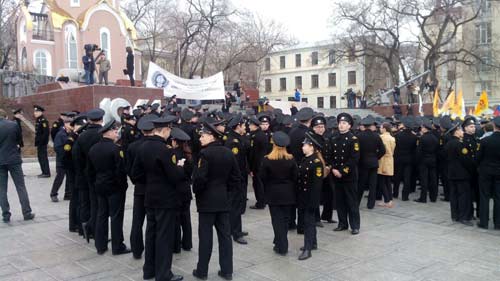С самого начала бросилось в глаза количество молодых людей в форме из Морского Государственного Университета, а также обилие знамён политических сил. И это при том, что, по словам организаторов, политического оттенка мероприятие не несло.