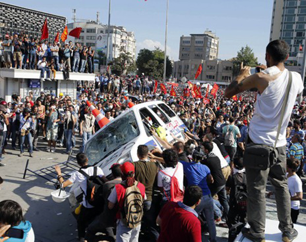Как бы то ни было, сначала протесты в Стамбуле переросли в столкновения с полицией, которая применила слезоточивый газ и водометы. 31 мая минимум 63 человека были задержаны и 12 ранены. В выходные протесты, по официальным данным, охватили 50 из 81 провинции страны, в считанные дни прошла почти сотня демонстраций. В ночь на 2 июня на улицы Анкары вышли минимум 20 тысяч протестующих. Губернатор Анкары вынужден был стянуть к дворцу премьер-министра Реджепа Тайипа Эрдогана военные подразделения. К вечеру понедельника число задержанных превысило тысячу человек, в Стамбуле один человек погиб. Кадры протестующих, скандировавших «Диктатор Эрдоган», «Правительство в отставку», «Нет фашизму», а также лозунги против «сухого закона», мусульманских школ и исламизации страны в целом обошли весь мир.