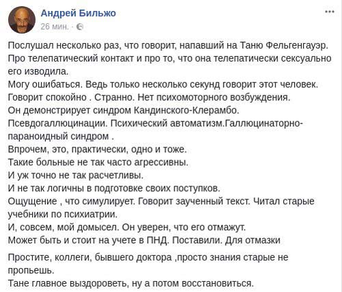 «Нападение на Татьяну Фельгенгаур – это логическое продолжение серии безнаказанных нападений на гражданских активистов и журналистов. На Татьяну, как и на любого журналиста или даже не журналиста, а учителя, врача, дворника.... просто не могли не напасть в стране, в которой отморозки и психи давно усвоили «золотое правило» нашего бытия: нападение на «неправильных» журналистов и активистов – это смягчающее вину обстоятельство...