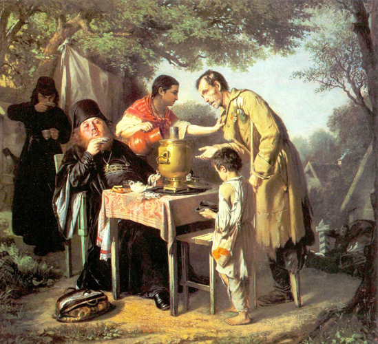 Дополнительную коннотацию создает картина Перова «Чаепитие в Мытищах» — там огромных размеров поп с аппетитом пьет чай со сливками, а перед ним робко стоят двое изможденных нищих, отец с мальчиком; оба в лохмотьях и вообще изображены со всей сентиментальностью русского передвижничества. Современней некуда.