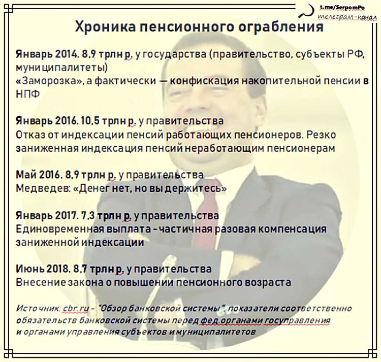 показал хронику пенсионных грабежей правительства и сколько у него в это время было денег (см внизу). А вывод делает такой:
