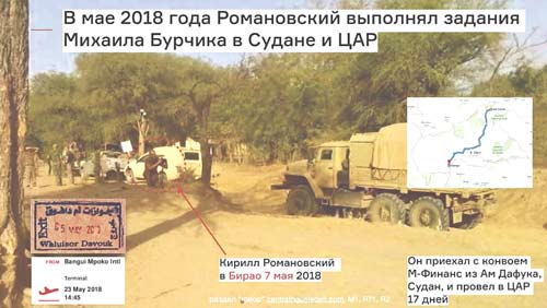 В «Досье» утверждают, что на сайте была обнаружена фотография, на которой Романовский запечатлен в районе Бирао (город на севере ЦАР, в 45 км от границы с южным Суданом) 7 мая 2018 года. По данным «Досье», источник которых не указан, Романовский якобы прибыл в Бирао из суданского Ам Дафука с конвоем «М-Финанс» и провел там 17 дней.