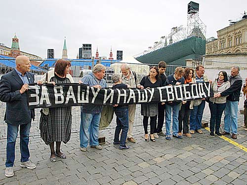 Тем не менее некоторый прогресс имеется: участников никто не собирается совать в психушки и судить за антисоветскую деятельность. Их не избивали: Красная площадь же, туристы. Так что полицаи были вполне себе вежливы. Только плакат порвали да корреспондентке «Новой газеты» фотоаппарат разбили.