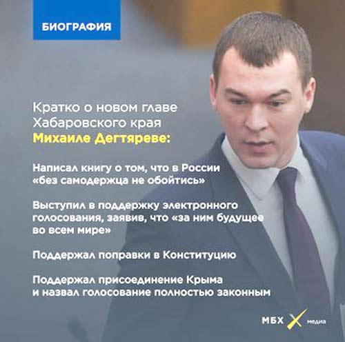 «39-летний Дегтярев станет всего четвертым губернатором Хабаровского края за 30 лет и первым не имеющим никакого отношения ни к Хабаровску, ни к Дальнему Востоку вообще. Он родился в Самаре в номенклатурной семье (дед Дегтярева в 1962–1972 годах был вторым секретарем Ульяновского обкома КПСС). Окончил самарский аэрокосмический лицей и аэрокосмический университет по специальностям инженера по двигательным установкам и после этого строил типичную карьеру, которую в советское время назвали бы комсомольской: еще в вузе вступает в кремлевское молодежное движение «Идущие вместе», в 2001 году возглавляет его самарское отделение, а в 2003 году вступает в «Единую Россию» и курирует ее молодежные проекты в области. В 2004 году Дегтярев стал депутатом Самарской городской думы от «Единой России», но в 2005 году знакомство с Владимиром Жириновским меняет его жизнь: он вступает в ЛДПР и становится ее областным координатором, в 2007 году — депутатом Самарской областной думы, а в 2011-м — уже федеральной Госдумы, где был зампредом комитета по науке, а с 2016 года — главой комитета по спорту».