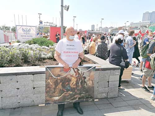 Бывший капитан дальнего плавания Владилен Юрьев стоял с картиной Эжен Делакруа «Свобода, ведущая народ», 1830 г. Надпись на его футболке «Немцы, помогите!!! Навальный должен жить!» вызывала у многих проходящих мимо дам в возрасте негативную реакцию, видимо, после просмотра российских телевизионных программ типа соловьева-кисилева. Он спокойно, терпеливо и убедительно разъяснял свою позицию. Я смело могу назвать его эффективным противоядием от зомбоящика.