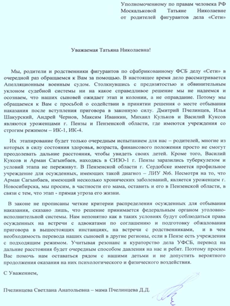 В заключение привожу письмо родственников ребят, осужденных по делу «Сети» – когда-то оно станет документом путинской эпохи. Это письмо, с которым родители ребят обратились к Уполномоченному по правам человека в РФ Т.Н. Москальковой. Они просили о милости – оставить их детей в колониях Пензенской области. По закону это возможно, но руководство ФСИН им и в этом отказало.