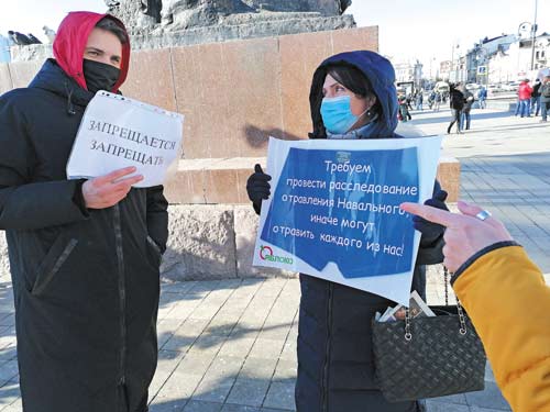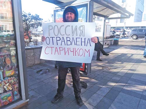 На центральной площади Владивостока в субботний полдень 26.12.2020 по многомесячной традиции собрались активисты. В этот день, как и во многих других городах страны, кроме «кормления голубей» в поддержку протестующего Хабаровска, люди повсеместно демонстрировали синие мужские трусы как символ протеста участия российских спецслужб в отравлении своих граждан запрещенным боевым отравляющим веществом «Новичок». ФСБ постаралась, усилив негодование всех порядочных людей, превратившись, как ее стали называть, в федеральную стирку белья после сногсшибательного ролика Навального с признательными показаниями фээсбэшника Кудрявцева о стирке его синих трусов для сокрытии следов отравления (преступления).