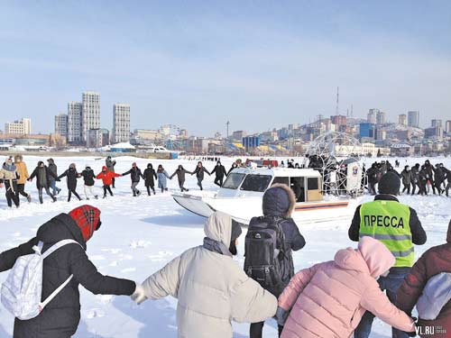 31 января во Владивостоке прошла, пожалуй, самая необычная акция за последнее время. В этот раз, после того как ОМОН начал оттеснять протестующих, люди были вынуждены пойти на лед Амурского залива. Митингующие водили хороводы, скандировали лозунги, и устроили владивостокскую «Аквадискотеку».
