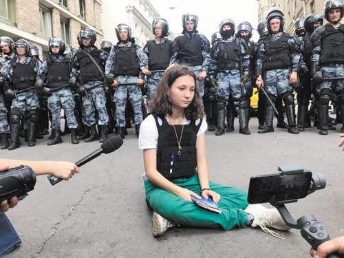 1 год назад. Одна из самых запоминающихся участниц московского протеста — 17-летняя Ольга Мисик. Та самая дружелюбная девушка, читающая Конституцию ОМОНу. А вот она же. Бегает по Москве и клеит стикеры с призывом выйти на митинг на спины полицейских. Сейчас её судят, и прокурор требует для неё два года лишения свободы. Её последнее слово: