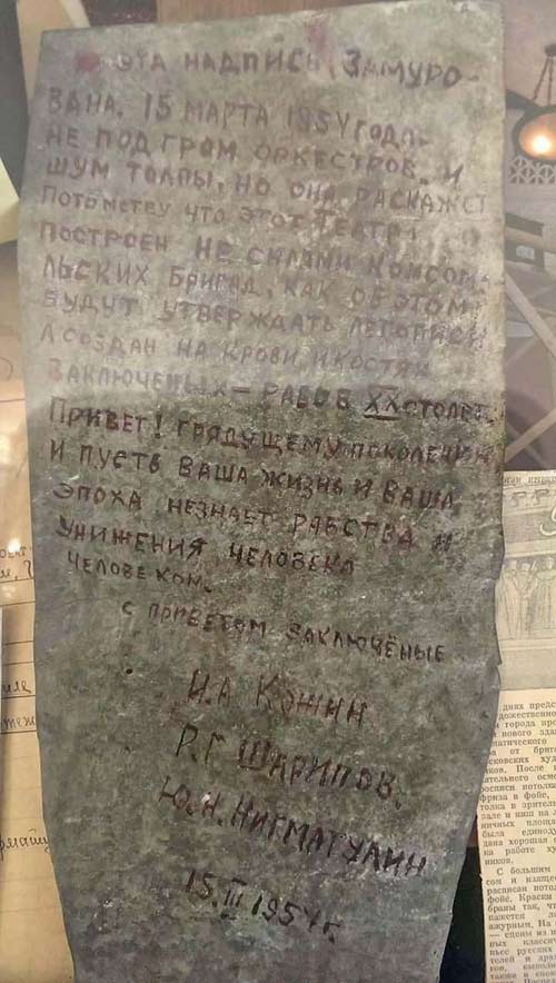«Этот театр построен не силами комсомольских бригад, а заключёнными. Привет грядущему поколению, пусть ваша жизнь и ваша эпоха не знает рабства!»