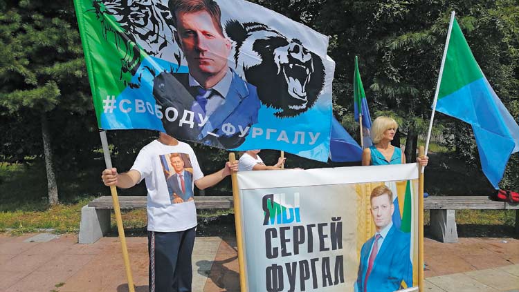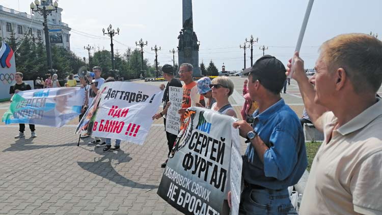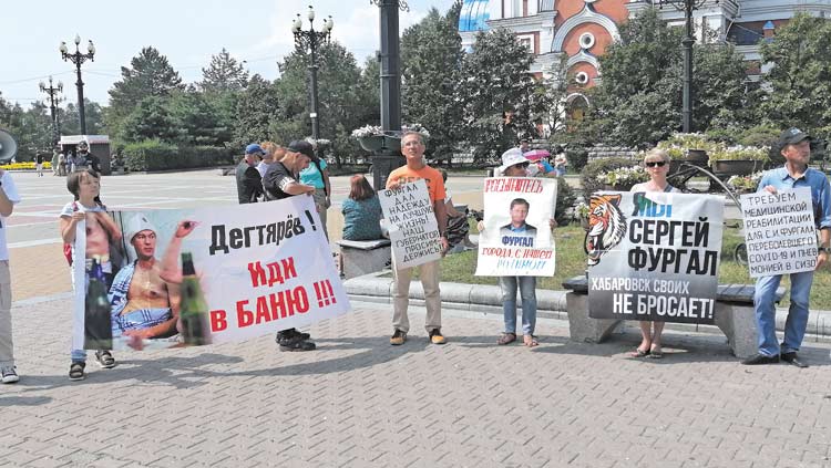 Зря похабничал.Голубое пламя - куда «Хабаровск своих не бросает!», азалётным потрошителямничего не забывает - озаряет умильные баннеры в антивандальной плёнке с главным действующим лицом, которое изначально нетрадиционно заявило о себе в парной, атеперь на улицах всего города: «Дела важнее слов!». Ответна плакатехабаровчанв «бессрочных простестах»: «Дегтярёв, иди в баню !», «Москва, верни Фургала!»