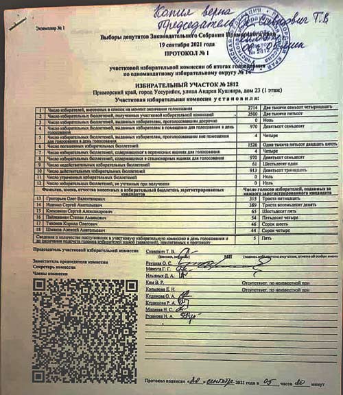 Для начала предлагаю вам на обзор заверенную собственноручно председателем участковой избирательной комиссии Сивкович Т.В. копию протокола № 1 от 20 сентября 2021 года, скреплённую солидной круглой печатью.