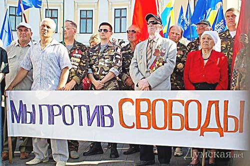 Или вот в Крыму запретили партию «Свобода». И вышли эти запретители с лозунгом «Мы против свободы». О, sancta simplicita! Хоть бы кавычки поставили.