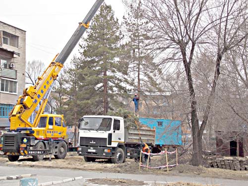 Есть такой маленький и вполне милый уголок на перекрестке улиц Покуса и Ленинской. Шесть могучих сосен, среди них – скромная белоствольная березка. Красивое местечко. То есть было. Потому что сейчас там орудуют строители, урчат пилы, желтая стрела погрузчика тащит за пышную крону деревья, укладывая в стоящий тут же грузовик, оставляя на месте посаженных 40 лет назад жильцами деревьев пеньки…