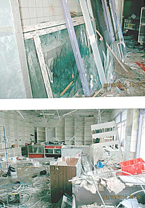 Оставшаяся часть офисной мебели, технологического оборудования (холодильники, витрины, оргтехника, стеллажи) остекленные металлопластиковые конструкции, подвесные потолки разбиты и не подлежат дальнейшей эксплуатации.