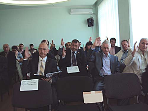 На нижнем снимке: вновь избранные депутаты на очередных выборах 14 сентября дружной «семьей дружным поднятием рук по-старому» единогласны за принятие решений.