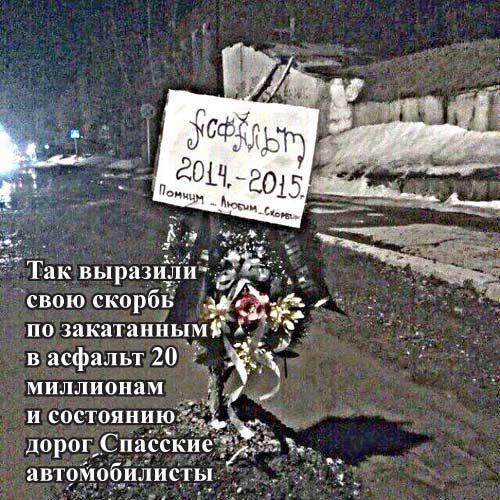 На днях скоропостижную кончину Спасских дорог почтили трауром безутешные автомобилисты. На улице Советской, в районе суда, они установили похоронный венок и скромную табличку: «Помним… Любим… Скорбим!».