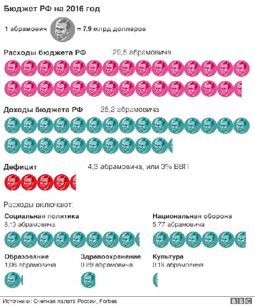 Расходы федерального бюджета на следующий год утверждены на уровне 16,098 трлн рублей, что составляет 29,5 абрамовича. Таким образом, легко увидеть, что федеральный бюджет России в 2016 году имеет дефицит в 4,3 абрамовича.