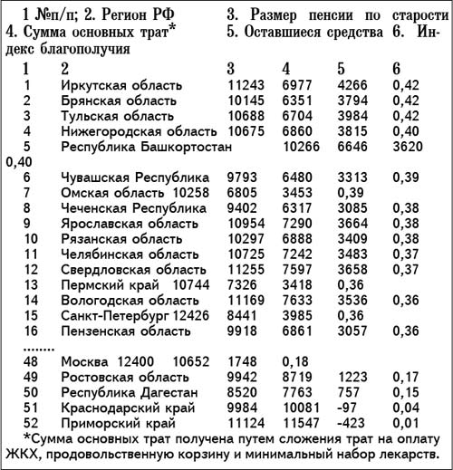 В аутсайдерах Приморский край, который завершает рейтинг. Если предположить, что пенсионер получает среднюю пенсию 11124 руб., платит 5 954 руб. за жилищно-коммунальные услуги, 5 093 руб. тратит на продукты (продуктовая корзина) у пенсионеров даже не остается средств на лекарства, он уходит в «минус». Пенсионеры Краснодарского края по тому же принципу остаются «должны» 97 рублей. Также в зоне социального риска оказались Ханты-Мансийский автономный округ – Югра, Хабаровский край, Москва. В этих регионах – при внешне высоком уровне пенсии, очень высокий уровень цен, не позволяющий чувствовать себя вполне благополучно. Что характерно, в наименее благополучных регионах, наблюдается низкая активность жителей, пользующихся электронными услугами Пенсионного фонда России (рейтинг ЦИПР от 07.08.2015).