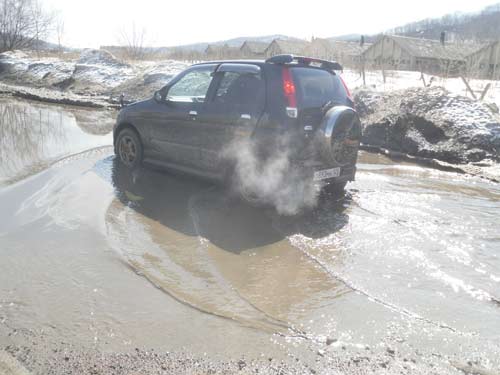 И на «озерах» мы были. Здесь ямы по колено в глубину, величиной с небольшую квартиру. Петрович, который возил меня, говорит: у некоторых, у кого машины маленькие, вода в салон заливается. Впрочем, умников хватает — могут по льду на другой край острова поехать.
