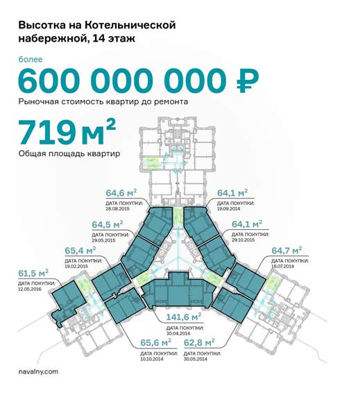 Вернемся на Котельническую. Вот как выглядит сейчас парад квартир, купленных Котляренко (схема справа).