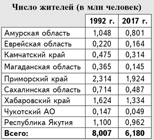 Все девять регионов Дальнего Востока дотационные (убыточные). Это значит, что дорог не будет никогда. По числу населения регионы умирающие, то есть перспективы развития бизнеса ежедневно сокращаются. По Дальневосточному округу за последние 25 лет численность населения (по информации из Википедии) уменьшилась так: