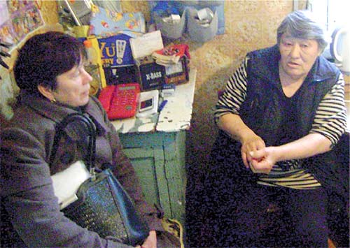 80-летняя Галина Григорьевна Николаенко с болью и грустью рассказывает депутату Ирине Ищенко (слева) о том, что в райбольнице не нашлось хрусталика на неотложную операцию; она почти ничего не видит и не сможет подоить своих восемь коров.