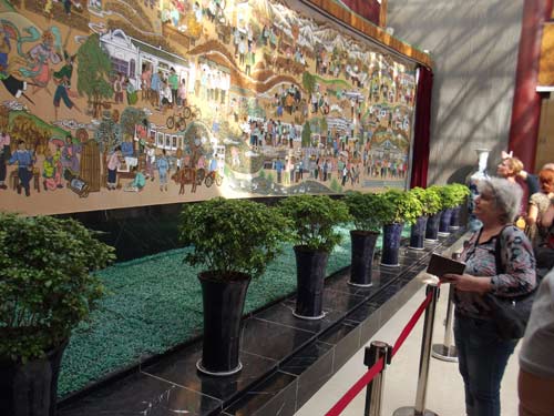 На обратном пути мы заехали в поселок Дон Фа, где построен настоящий дворец – музей искусства живописи местных жителей. Откуда столько талантов в отдельно взятой деревне? Летом все они занимаются сельским хозяйством, а зимой рисуют. Кроме отдельных картин они создают коллективно (группы лучших художников) огромные (до 70 м2) живописные панно, в основном, отражающие сельскую жизнь, работу и развлечения. Их картины можно увидеть даже на международных выставках, а некоторые с удовольствием покупают.