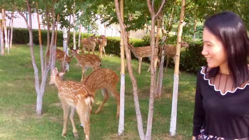 Выйдя с фабрики, мы сели в автобус и тут же выскочили из него, потому что увидели чудо. На зеленой лужайке прямо возле дороги паслось стадо пятнистых оленей. Они никого не боялись, почти ручные. Нам удавалось дотронуться до них, сфотографировать их и сфотографироваться вместе с ними.