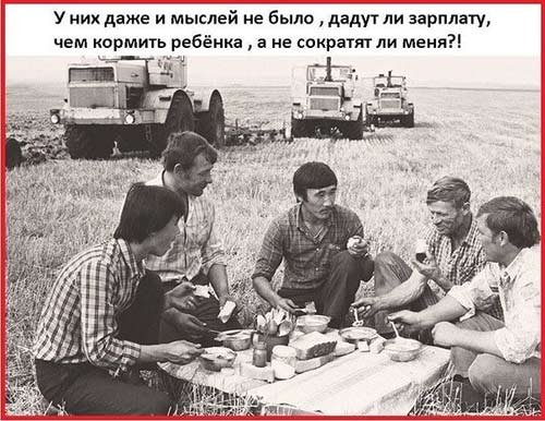 Фотография времен СССР – освоение целины, обед трактористов в поле.