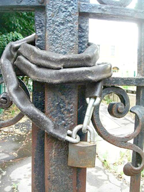 На железных воротах, предваряющих вход в музей Н. Рериха, массивный замок и угроза разграбления, растаскивания по частным коллекциям и аукционам наследия, которое собиралось с таким трудом и было предназначено каждому россиянину.