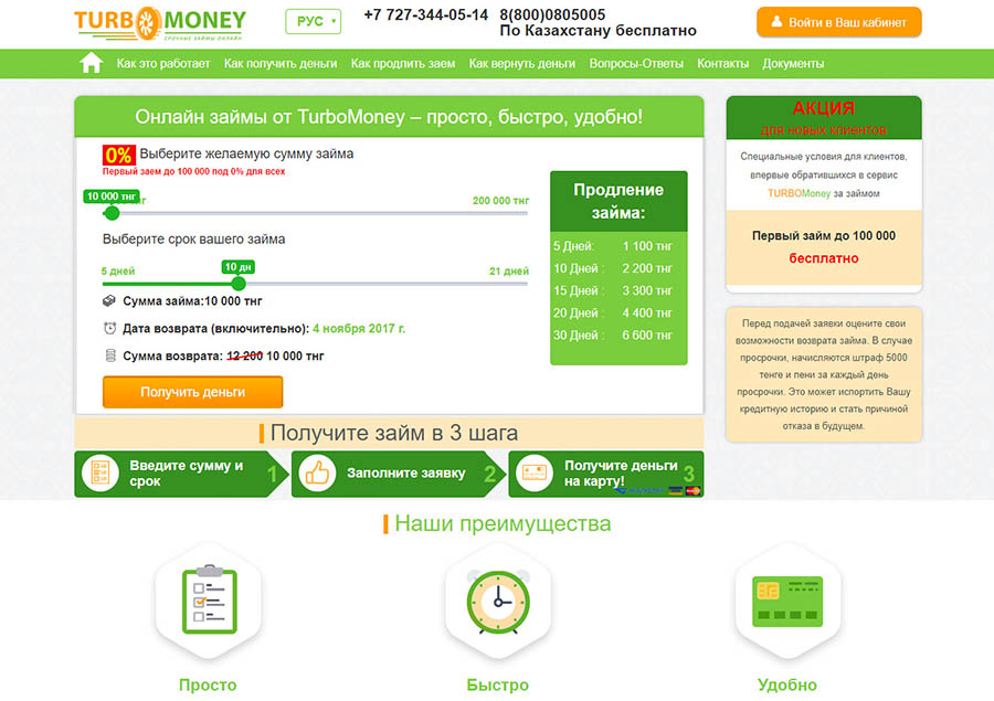 Выдача кредитов Турбомани дает возможность получить от 10 000 до 200 000 тенге всего за 10 минут. Если вам нужны деньги прямо здесь и сейчас, то именно Турбомани поможет вам и предоставит сервис высокого качества. Деньги поступают на карту или банковский счет сразу же после оформления кредита. Не нужно ждать подтверждения банка в течение какого-то периода или других проверок. Клиенту не нужно тратить много времени на сбор необходимой документации. Достаточно будет иметь паспорт, что подтвердит его личность.