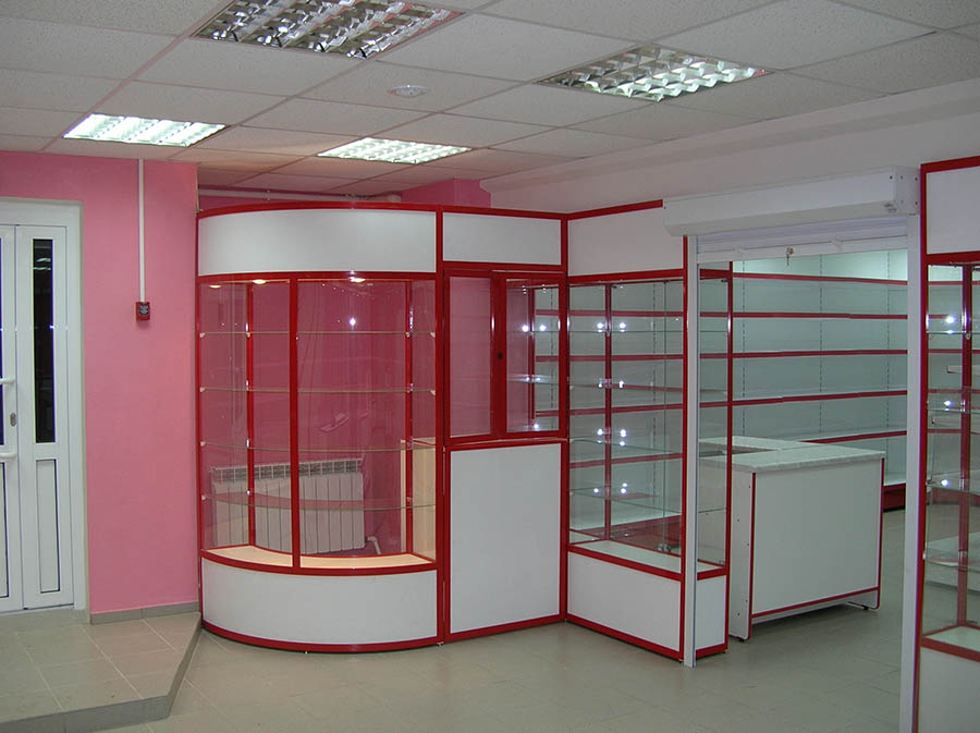 - витрины — зачастую располагаются вместо стены, но могут находиться и внутри магазина;