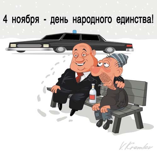 Вопрос: я и моя одноклассница едины в день единства четвертого ноября с теми же депутатами и чиновниками? За себя отвечаю – НЕТ. Те, кто не способен сделать так, чтобы основная масса россиян жила, а не выживала, для меня – враги народа. Ведь в одной из богатейших стран Мира, в нашей России, полагаю, по существу не может быть бедных. А они есть, и в очень большом количестве.