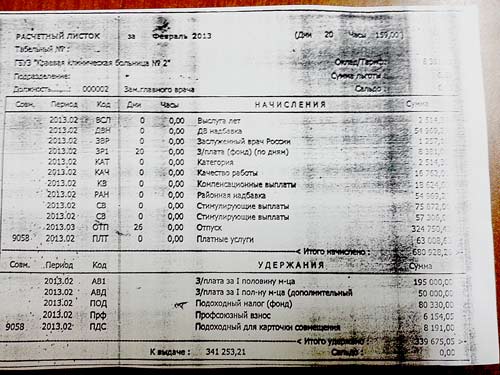 Как выяснилось, вышеуказанные суммы в основном шли на заработные платы руководящего эшелона (главного врача, заместителей, главного экономиста, главного бухгалтера). Заработные платы данных сотрудников составляли от 350 до 680 тысяч рублей, это было официально озвучено на собрании коллектива больницы 20.01.2014 г., т.к. есть документы, подтверждающие подобные выплаты.